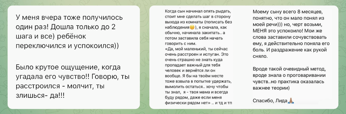 | | | | - "У меня вчера тоже получилось один раз! Дошла только до 2 шага и всё) ребёнок переключился и успокоился)) Было крутое ощущение, когда угадала его чувство!!";