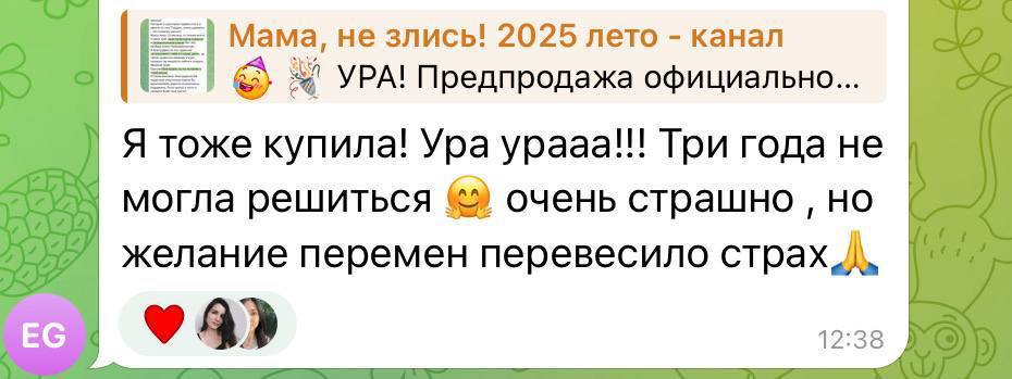 | Мы ошиблись, и вчера вам пришло письмо для приоритетного списка (вы же записаны в предзапись) об окончании пред-предпродаж курса «Мама, не злись!». Приносим свои извинения, если потревожили! 🙏 | | | | Продажи для предзаписи будут длиться до 10 сентября включительно, стоимость зафиксирована и не поднимется до окончания продаж. Все бонусы вы также получаете в независимости от того, когда внесете оплату. Нам важно, чтобы вам было спокойно! | | | | Единственный риск тянуть до 10 сентября – могут закончиться места к желаемому куратору или на первый тариф. Мы рекомендуем внести предоплату в качестве брони. У вас будет почти 4 недели, чтобы внести остаток или оформить рассрочку в выбранном банке. Это поможет не переживать, что вы что-то упустите! | | | | Но и это не конец света! Прикладываем отзыв новоиспеченной ученицы – всему свое время❤️ | | | | Но если хотите сейчас – идите сейчас, не ждите несколько лет. Сейчас, например, с сентября вступает закон о запрете рекламы в запретграме, поэтому как и что мы будем делать дальше – большоооой вопрос. Конечно, мы всей командой обожаем наш проект и верим в его силы и найдём способы! Курса через год уже может не быть (тьфу-тьфу). Поэтому я бы ничего не загадывала. Да и ни детям, ни вам ждать столько незачем! | | | | Вы получили это письмо, так как зарегистрировались на сайте проекта Mamam.tut | Если вы хотите отписаться от получения этой рассылки нажмите здесь | | | |